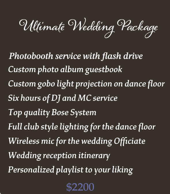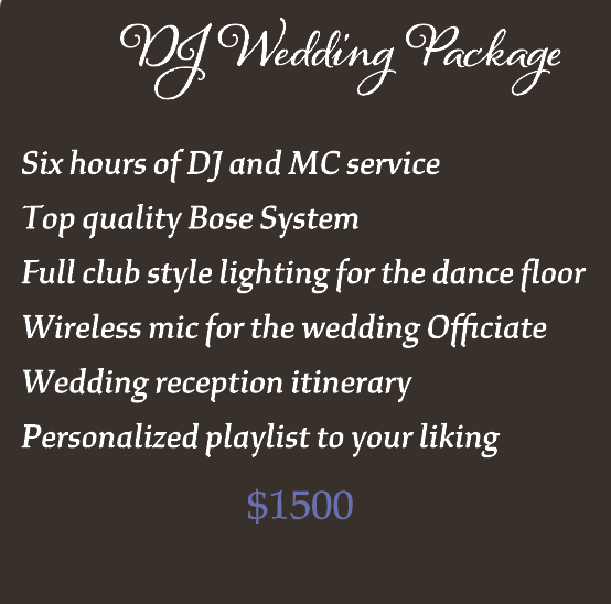 In addition to playing the music that you want played at your wedding, We will make all the important announcements and coordinate with the caterers and photographers to insure that all the right people are in the room to capture the special events such as the cake cutting, first dance, etc. prior to announcing that the events are taking place. It is our job to do all the work and make your wedding run smoothly so that you can enjoy yourselves on your special day!